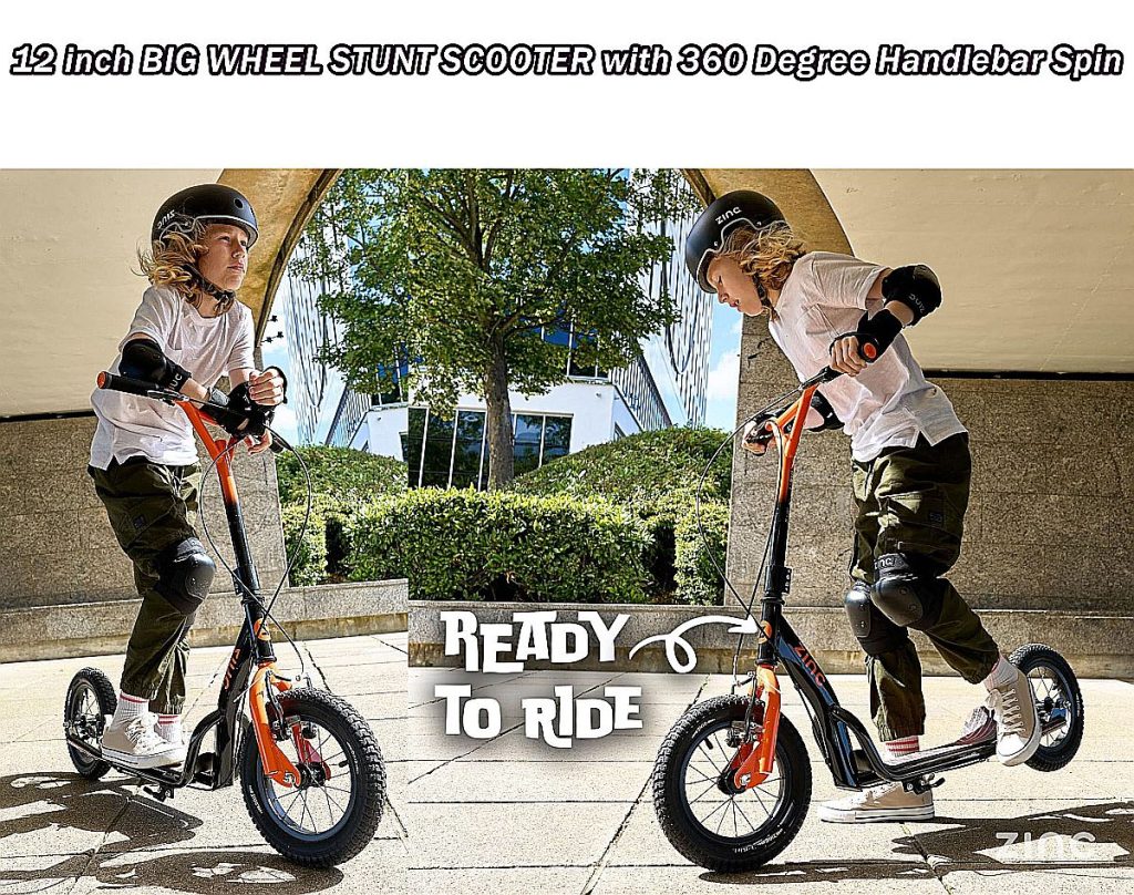 Zinc BMX Scooter for Kids Ages 6+ – 12 Inch Big Wheel Stunt Scooters with 360 Degree Handlebar Spin, Height Adjustable, Front & Rear Brakes, Steel Frame, Off-Road Tyre